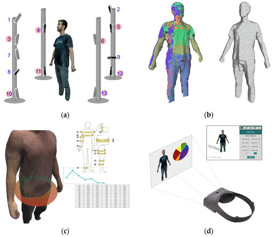 Proposed framework system based on an RGB-D camera network (a). Body models: point clouds and mesh (b). 3D body measurement (c) and textured representation with virtual reality (VR) devices (d).