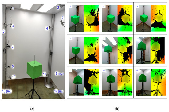 (a) Experimental set-up 13 RGB-D cameras. “nv” means a camera not visible in this image. (b) Acquisition results for the cameras (color and depth images). The green cube has been used for extrinsic calibration. Images from high, intermediate and super-low levels are shown.