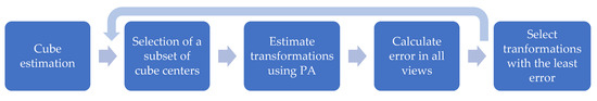 Once the models of the cube have been estimated in different positions for all cameras, their centers are calculated. The centers allow us to obtain a set of representative points with which to calculate the correspondences between cameras and the corresponding transformations. The calculation of the transformations between cameras is carried out with a Procrustes analysis. In order to avoid outliers and to make it robust, RANSAC [24] is applied. This process allows the selection of a set of views that minimize the error in the calculated transformation. This is the one that minimizes the angles between the normal vectors of the patches and the distance between the centers. This process is first carried out for each row of cameras independently, as they can see common planes, and, after the rows are aligned, each using the other cameras per row that are in the same mast.