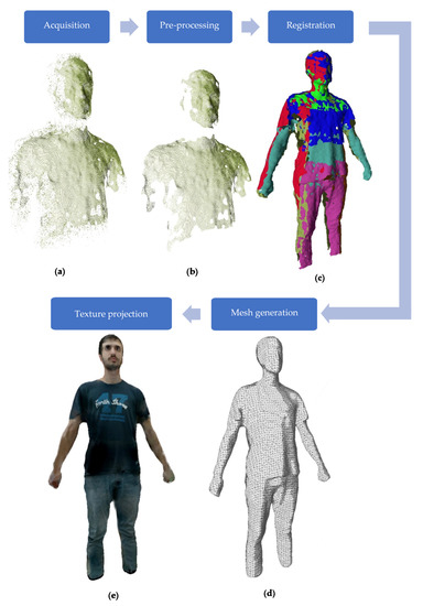 Pipeline of 3D body reconstruction. The system is able to acquire several images from cameras (a) that are preprocessed in order to improve the quality of the acquisition (b). The set of points are registered in a single coordinate system (c). Finally, in order to obtain the dense 3D model of the body, the 3D points are converted into a mesh (e) and the color images that were captured synchronously with the point cloud are texture-mapped onto the mesh (d).