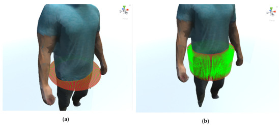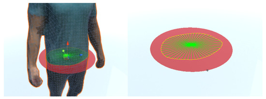 Since the system has been designed to be used by dietetic specialists, the selection of the perimeters and volumes to be measured must be done by the specialist and not automatically. An interface has been designed to allow a circle to be placed anywhere in the space, so the specialist should indicate the height of the 3D model of the body to be measured. In addition, the circle can be angled to be properly oriented for measuring body parts such as arms. Finally, the size of the circle is automatically adjusted to the surrounding figure. In Figure 9a, a circle can be seen sectioning the waist part of the body. For the selection of volumes, a similar scheme has been chosen in which a cylinder is located and sized around the part of the body whose volume is to be measured.