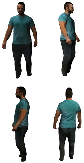 In order to create a realistic visualization, the mesh is textured using projection techniques. The method proposed by Callieri et al. [31] was used to carry out the raster projection and texture generation. This method generates parameters of the mesh in relation to its vertices and generates the texture based on the projection of the different images considering the position and orientation of the different cameras. Figure 4e shows the same body represented by the mesh with the projected texture. A demo video of the whole process of the 3D model generation can be found in [32].