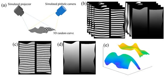 To train the network, the fringe projection and imaging process are simulated using the principle of the pinhole imaging, as shown in Figure 1. A classical four-step classic phase shift method is used to record four surface images modulated with phase-shifted fringes: I(x, y; 0), I(x, y; π/2), I(x, y; π) and I(x, y; 3π/2), where (x, y) is the coordinate of the pixels, as shown in Figure 1b. The inverse pinhole model is used to simulate a projector to project the stripe map onto an arbitrary surface, and the pinhole model to simulate a camera to trace the ray and form the image in the simulation. Thus, the phase ϕ can be calculated by these images, as: