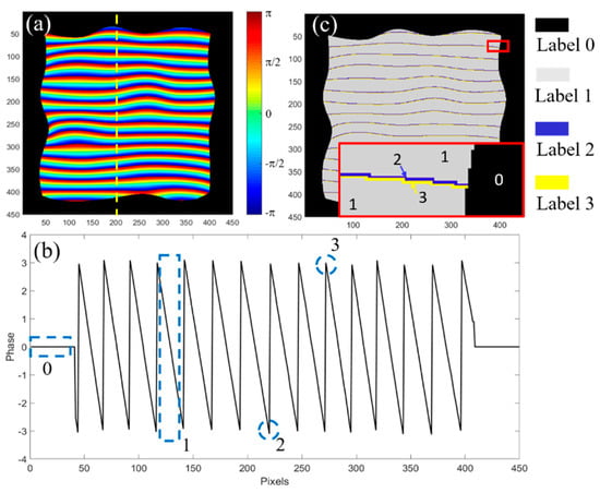 Four features of the wrapped phase for unwrapping phase. (a) wrapped phase, (b) phase distribution of one column indicated by the yellow dashed line in (a), and (c) segmented wrapped phase with labels.