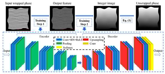 As shown in Figure 3, the same network architecture is actually used twice with different outputs. Network I is trained to do the segmentation process, and the output is the 4-label segmented image; while network II is trained to assign the segmented image to the integer label. Finally, the unwrapped phase can be obtained using Equation (1). One major feature of the proposed deep learning based phase unwrapping method is that, in network I only 4 labels are used to characterize the wrapped phase information, the number of wrapped phase regions is unlimited. In addition, the size of the image is unlimited as well.