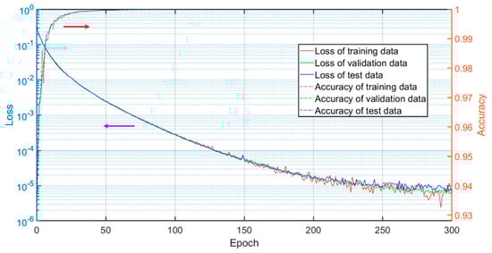 The losses of the training dataset, the validation dataset and the test dataset are plotted in Figure 4. Note that Figure 4 shows the losses of Network II since the loss of the final output shows the accuracy of the entire process. As the epoch increases, the losses are reduced accordingly, and then converge after about 300 epochs, illustrating explicitly the effectiveness of the training process. As expected, the loss of the training data (red solid line) is the lowest of the three, while the loss of the test data (blue solid line) is the highest. The accuracy is calculated based on the root mean square error between the output and the GT. From Figure 4, it can be seen that the accuracies are very high after about 50 epochs, implying the proposed network architecture can effectively retrieve the features of the wrapped phase. The accuracy of the test data around 300 epochs is as high as 99.98%.