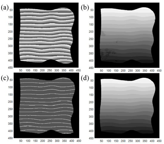 Figure 6 demonstrates one advantage of the proposed method over the method of directly assigning the integer level to each segment of the wrapped phase in fringe projection 3D imaging. Figure 6a is the wrapped phase, and Figure 6b is the map of the assigned integer using the network architecture reported in [14,15]. Some errors can be found in the bottom left corner in Figure 6b. The outputs using the proposed method are shown in Figure 6c,d. Figure 6c is the segmented image with four labels from network I. From the map of the assigned integer from network II, the error is effectively suppressed. The accuracies of the unwrapped phase are 98.24% and 99.98%, respectively, using directly training and the proposed two-step training method.