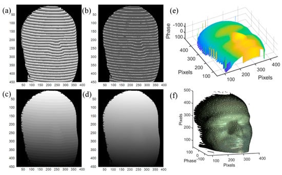 Fringe projection 3D imaging is a widely used technique for shape measurement [1,2,3,4,5]. As shown in Figure 1, by projecting three or more phase-shifted structured light, typically linear sinusoidal patterns, onto the surface under the measurement, multiple images of the surface with distorted phase-shifted fringes can be captured to estimate the surface shape. The phase calculated from the images modulated with phase-shifted fringes is wrapped to the range of (−π, +π] due to the inverse trigonometric computation. One essential step in 3D imaging with fringe projection method is to unwrap the wrapped phase. Various phase unwrapping approaches have been developed in past few decades to improve the speed and accuracy [6,7,8,9,10,11,12].