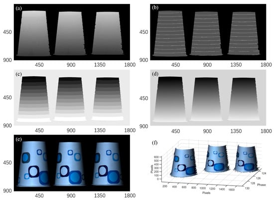 It should be noted that the isolated wrapped phases cannot be correctly unwrapped independently. Typically, one needs to obtain the relative position between isolated objects first with the low frequency of the projected fringes. Figure 13a is the phase distribution of the three paper cups with only one phase region. With the help of Figure 13a, we can transform the phase feature map obtained from the phase shift fringe with high frequency (as shown in Figure 13b) to the phase feature map with appropriately assigned integer to each segment (as shown in Figure 13c). Using Equation (1), the unwrapped phase can be finally obtained, as shown in Figure 13d. Based on Figure 13d, one can reconstruct the 3D surfaces of the three paper cups by subtracting the phase of the background [20], and clearly see the depth of each paper cup. Note that, here we only show the relative position of the three paper cups. If one needs to obtain the absolute distance between each paper cup, the calibration should be done first [21]. Figure 13e is the 2D color image of the paper cups for comparison and Figure 13f is the reconstructed 3D surface.
