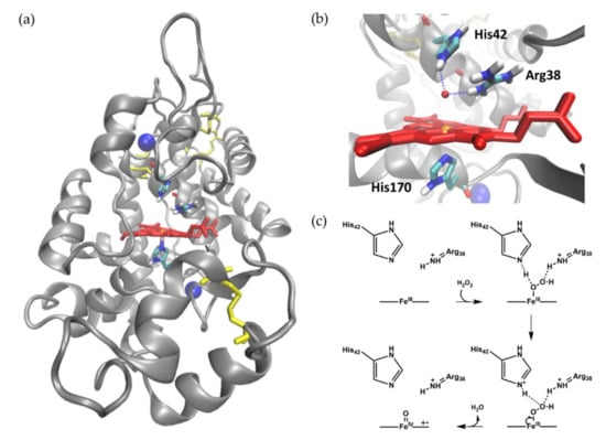 Figure 1 shows the overall structure of HRP isoenzyme C1A as well as the active site arrangement which is common in all plant peroxidases. HRP C is a monomeric and mainly α-helical glycoprotein with a molecular weight of 44 kDa. Furthermore, HRP contains four disulfide bonds and two calcium ions, both of which are important for the enzyme’s structural stability [32,33]. Figure 1b shows a close-up of the active site highlighting the cofactor and three amino acids, which have been identified as highly conserved and essential for the high activity of heme peroxidases. His170 coordinates the heme iron on the proximal side and anchors it in the center of the enzyme. The sixth coordination site is the substrate binding site and vacant in the enzyme’s resting state. During catalysis, the distal amino acids Arg38 and His42 facilitate the efficient heterolytic cleavage of the bound peroxide by abstracting and donating protons and by stabilizing leaving groups, as depicted in Figure 1c [34,35]. Upon reduction of hydrogen peroxide, water is released and Compound I, a high-valent reaction intermediate with an Fe-oxoferryl center in oxidation state +IV and a porphyrin-based cationic radical, is formed. The three main reaction steps of heme peroxidase catalysis are described with Equations (2)–(4) [32,35]: