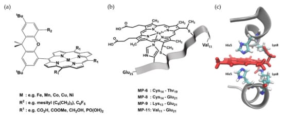 Additionally, various biomolecules were shown to increase the activity of the heme cofactor upon complex formation by preventing its aggregation and providing acid-base functionalities for catalysis. The interaction partners range from G-quadruplexes (DNAzymes) [51] and monoclonal antibodies (Hemoabzymes) [52] to short peptides, including amyloid β peptides involved in Alzheimer’s disease [53,54]. Presumably, the most prominent examples of peroxidase mimics though are microperoxidases. These mini-enzymes with peroxidatic activity are prepared via proteolytic digestion of cytochrome c, leading to formation of heme-peptide complexes with a polypeptide chain of typically six to eleven amino acids (MP-6 to MP-11), as shown in Figure 3b [55]. The recently reported fully synthetic approach for the synthesis of microperoxidases further opened up new possibilities for the design of customized heme-peptides incorporating even non-natural groups [56]. Microperoxidases were shown not only to possess a peroxidase-like activity, but also to catalyze dehalogenation reactions [57] and oxygen-transfer reactions similar to cytochrome P450 enzymes [58], making them attractive tools for the construction of biosensors. Nastri et al. also pursued an approach for the rational design of heme-peptide conjugates. By using the β-chain of human deoxyhemoglobin as the template, they designed mimochrome I, a complex composed of two helical peptide chains and a deuteroporphyrin arranged in a helix-heme-helix sandwich structure [59]. Figure 3c shows exemplarily the crystal structure of Co-mimochrome IV, one of the subsequently created mimochrome variants incorporating different metal centers and polypeptide chains [50]. The prototype Fe-mimochrome I was characterized by two symmetrical peptide chains with histidine coordinating the central metal ion on both sides, and thus did not show significant peroxidase activity. Fe-mimochrome VI on the other hand, obtained after iterative optimization, has an asymmetric structure and a vacant coordination site at the iron center [60,61]. The most recent mimochrome was reported to be highly active towards oxidation of classic peroxidase substrates as well as nitration of phenols, with the reaction proceeding via formation of Compound I [62].