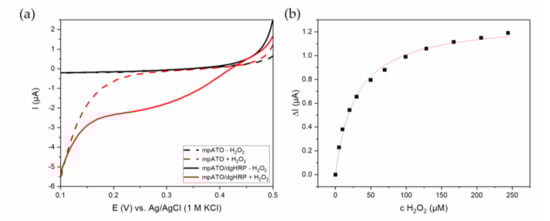Electrocatalytic reduction of hydrogen peroxide by dgHRP adsorbed on mpATO. (a) Linear sweep voltammograms of bare (dashed lines) and dgHRP-modified (solid lines) mpATO before (black) and after (red) addition of 2 mM hydrogen peroxide in air-saturated 100 mM phosphate buffer, pH 7.4. Scan rate 2 mV/s, stirring speed 500 rpm. (b) Concentration dependent current increase of a dgHRP modified mpATO upon hydrogen peroxide addition obtained from amperometric measurements at 0.2 V vs. Ag/AgCl. Data were fit to the Michaelis–Menten equation. Adapted from [38].