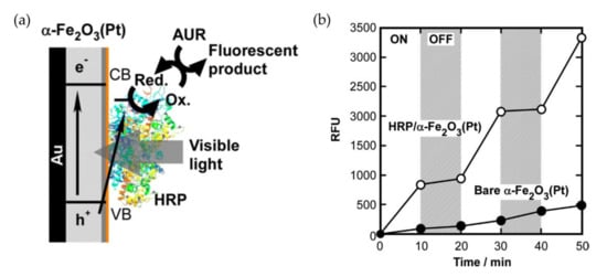 Light-driven conversion of Amplex Ultrared (AUR) by HRP on Pt-doped hematite thin films. (a) Schematic illustration of photoinduced enzymatic reaction by HRP adsorbed on Pt-doped α-Fe2O3 thin film. AUR is catalytically oxidized to a fluorescent product by the HRP bound to the film under visible light illumination. (b) Photoswitching behaviors of catalytic oxidation of 0.1 mM AUR by bare or HRP-adsorbed α-Fe2O3(Pt) under intermittent blue light irradiation (2 mW/cm2). Reprinted with permission from Kamada et al., 2012 [108]. Copyright (2012) American Chemical Society.