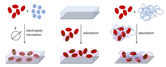 Schematic illustration of different ways of combining biomolecules and organic semiconductors for the fabrication of sensors: entrapment during electropolymerization or co-polymerization, adsorption to pre-polymerized films or adsorption of enzyme/polymer mixtures on the surface.