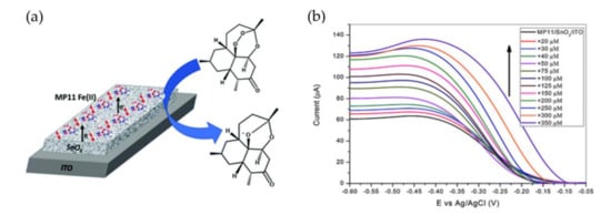 Additionally, microperoxidase/semiconductor systems have also been used for the electrochemical detection of other compounds than hydrogen peroxide, including glucose via combination with glucose oxidase [144] or nitric oxide [145]. Recently, Ioannidis et al. presented an approach for the detection of the antimalarial drug artemisinin where MP-11 was adsorbed to a film of surfactant-modified mesoporous SnO2 on ITO [146]. Ferrous MP-11 catalyzes the cleavage of an organic peroxide within the artemisinin molecule, which leads to heme re-oxidation, thus invoking an enhanced electrocatalytic reduction current proportional to the concentration of the drug in solution (Figure 7).