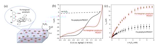 Hydrogen peroxide sensor based on electropolymerized Fe-porphyrins operating at moderate potentials in aqueous solution. (a) Schematic illustration of a co-polymer film of thienylated Fe-Hangman porphyrin and poly(ethylenedioxythiophene) (PEDOT) deposited on glassy carbon. (b) Linear sweep voltammograms of the porphyrin/PEDOT films before and after addition of 5 mM hydrogen peroxide at a scan rate of 2 mV/s. (c) Amperometric response of the porphyrin/PEDOT films to increasing hydrogen peroxide concentrations at 0.2 V vs. Ag/AgCl. Measurements were performed in 100 mM phosphate buffer, pH 7, at a stirring speed of 300 rpm.