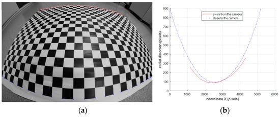 The depth dependence of lens distortion model was presented by Magill in [4]. Considering the depth influence upon distortions avoid systematic measurement error. Magill demonstrated that lens distortion depends on magnification and established the radial distortion model dependent on magnification. Magill’s model computes lens distortion at any specified focus distance. However, this model is valid to points in the “in focus” depth distance only. Subsequent studies proposed magnification-dependent radial distortion models and calibration methods [5,6,7,8]. Brown [5] proposed a distortion model dependent on magnification that considers distortion outside the “in focus” distance plane when the magnitude of the distortion is small. Fryer [6] presented the decentering distortion formulation. Fraser and Shortis [6] improved the model proposed by Brown to solve the problem of small magnitudes in distortion. Alvarez [8] derived a new radial distortion model for planar scenes such as the soccer field combining Brown’s and Fraser’s models.