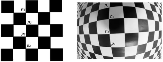 Since a checkerboard template arranges control points in straight lines, n is the number of straight lines and m is the number of points in each line, qk,l is a point k of the straight line l, where l = 1, …, n and k = 1, …, m. CR(p1, p2, p3, p4) is computed when the calibration template is designed.