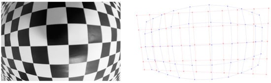 Minimizing previous function, distorted control points qd,i are corrected to undistorted ones qp,i. Figure 3 shows the result. Blue dots correspond to detected control points in the image qd,i and red lines correspond to the undistorted control points qp,i.