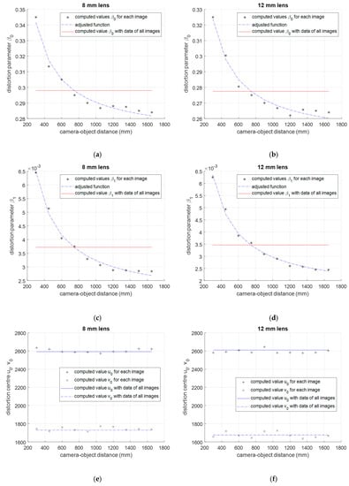 The variation of lens distortion parameters with the camera-object distance can be described with the equation proposed in (12) easily. A more complex function does not improve the results significantly. Going deeper, the Equation (12) is able to represent variation of lens distortion parameters when the model changes from first to second degree or when the lens changes. In this case, it has been validated for 8 mm and 12 mm lenses.