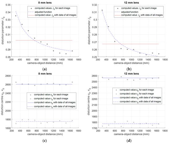One particular division model represents the distortion for one camera-template distance. The method to compute the model is described in Section 2.1.2, but in this case, control points of one image are used instead of using control points of several images. The computed parameters with each model are β0, β1 and the distortion center u0, v0, that are valid for one distance. Figure 6 shows the computed parameters for each image for 8 mm and 12 mm lenses. The variation of lens distortion parameters depending on the distance is similar if 8 mm or 12 mm lens are used. Distortion center u0, v0 does not change significantly when the camera-checkerboard distance varies, but distortion parameters β0, β1 change as it is shown in Figure 6a–d. As it was presented by Magill in [3] and shown in Figure 1, distortion is depth-dependent and distortion parameters are sensitive to the camera-object distance. The asterisks in Figure 6a–d show the computed value of parameter β0, β1 for each image and both lenses respectively. According to the sensibility of parameters β0i and β1i to the distance, the values of the lens distortion parameters decreases with the distance in an exponential form. In consequence, the following experimental function can represent the variation of the distortion model parameter β0, β1 with the distance d: