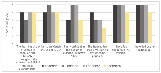 Based on the questionnaires filled out at the end of the 2017/2018 school year (Appendix C), teachers felt that the training was supportive (average of 4.75 over 5, N = 4) and useful (4.75/5) and felt confident with the use of KIBO (4.25/5) or with the design of related sessions (4/5) (Figure 3). All teachers scored similar results, regardless of their initial programming skills or their initial interest. Those results are similar to those obtained in the pilot test [24], where results ranged from 3.8 to 5 with a sample of 5 teachers and a similar final questionnaire. In addition, during the training, we observed that the emotional engagement of the teachers with the robot increased, as we saw significant changes in attitude from initial fear and frustration towards confidence and empowerment. We also noticed an interest in teaching at the subsequent summer workshop for the more advantaged teachers.