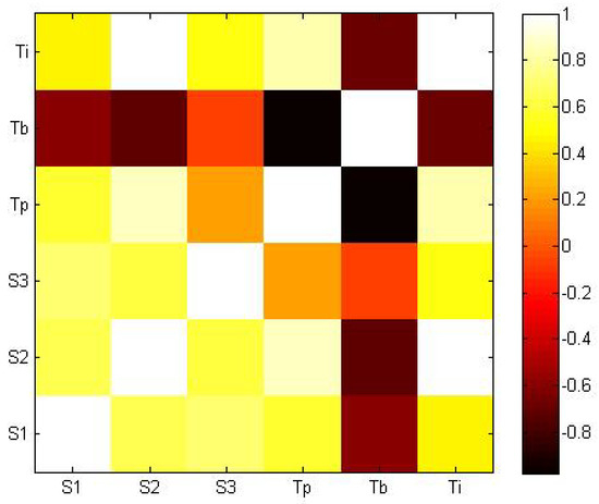 Correlation matrix containing Pearson’s correlation coefficients for each pair of variables: Light colours represent strong positive linear correlations, whereas dark colours document negative correlations. Orange suggests no correlation. Variables correspond to student’s marks in session 10 (S1), student’s final PTD evaluation criteria (S2), student’s increase between final and initial PTD evaluation criteria (S3), teacher’s performance during support (Tp), teacher’s initial level of programming ability (Tb), and teacher’s initial interest to receive support (Ti).