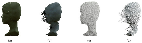 Generally, we can say, that applying the proposed algorithm improves depth image (Figure 9c) by reducing flying pixels, noise processes and filling the holes in the resulting 3D model.