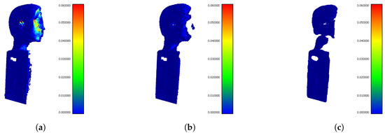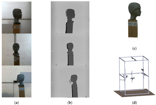 To verify the functionality of the selected filtration methods, we performed an experiment under real conditions on a static object. Three ToF cameras of type Microsoft Kinect v2 were used in the experiment. These cameras were placed in the scanning cabin, the design of which is shown in Figure 5d. In the center of the cabin, the model object is located in the range from 60 cm to 80 cm from the sensors. The object was represented by a plastic head with a relatively complex shape. The size of the object corresponds to normal dimensions of a child aged 5–10 years. The RGB images received from each camera are shown in Figure 5a, the depth frames of the scanned scene without interference (sequentially working cameras) for the individual cameras are shown in Figure 5b. These depth maps were used as reference data with no interference artifacts. Figure 5c is a reconstructed 3D model of a static object.