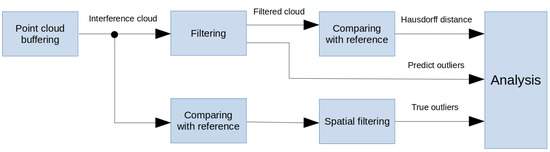 To objectively evaluate the performance of interference suppression we need to know about every point in the dataset, whether the point is true interference or not. The data distorted by interference were obtained in the parallel scanning mode of cameras. For obtaining ground truth information we used the spatial filtering of interference point clouds against the reference. The reference mesh, shown in Figure 5c, was obtained from the reference point cloud. The overall process of method evaluation is shown in Figure 6.