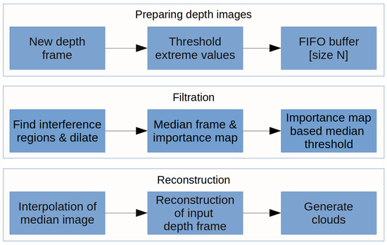 For the suppression and filtering of interference artifacts in the multi-camera system, we proposed an algorithm (see Figure 7). The algorithm is based on interference region extraction and interpolation in a series of images obtained from the camera. The algorithm was proposed mainly for the application of scanning parts of the human body but is not strictly intended only for this application field. The important prerequisite for filtering and interpolation is to have a sufficient number of subsequent depth frames in the buffer. The basic condition is that objects must have the same or very close position in each frame in buffer. This condition is met by fact, that object is static. In the case of the object which can make a move, we have to minimize the buffer size to avoid possible motion artifacts in the resulting depth map.