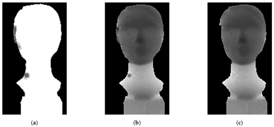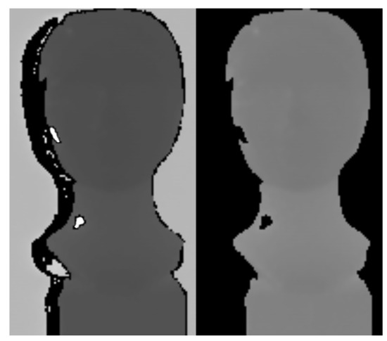 After depth thresholding, the background is removed and images include only the object of interest (Figure 8). This simple step is important and effective because it often removes areas with interference in which pixels tend to take extreme values (overflowing 32-bit stack variable).