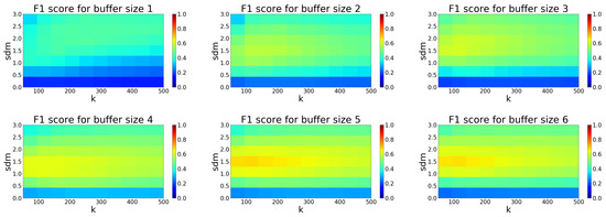Based on the analysis in Figure 11 we obtained the best setup for the SOR filter. The performance seems to have an increasing trend up to the buffer size 5. The ideal combination of parameters for buffer size 5 is 1.5 and k 100. At this setup, the algorithm achieves the best F1 score of 0.68, as seen in Table 1.