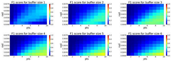 Similar to the previous case, the analysis in Figure 12 shows the best setup for the ROR filter. The performance of filtration is highest for buffer size 5. The ideal combination of parameters is 0.004 and 10. At this setup, the filter achieves the best F1 score of 0.63, as seen in Table 2.