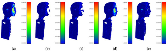 The comprehensive comparison of filtration methods using visualization of distances between filtered clouds and reference mesh. All the results are for buffer size 5. (a) The input point cloud without interference suppression. (b) The best result using SOR filter with parameters 1.5 and k 100. (c) The best result using ROR filter with parameters 0.004 and 10. (d) The best result using PointCleanNet for buffer size 6. (e) The best result using our IMBM filter.
