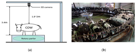 (a) Position of 3D camera; (b) image of cows in rotary parlor.