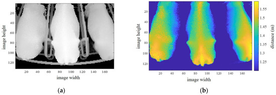 In our proposed system, a 3D camera is mounted 3.4 m above a rotary parlor. Data collection is done at a large-scale dairy farm in Oita Prefecture, Japan. The position of the 3D camera and an illustration of cows in the parlor are seen in Figure 1a,b. The 3D camera generates a resolution of 132 × 176 pixels in X, Y, and Z directions. X and Y are the x and y coordinates of the image and Z is the distance information (z or D0) of the image.