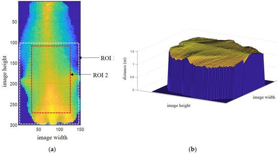 The proposed system uses a single 3D camera and generates data in csv format (comma-separated values). Each line of the csv data has 23,232 values for distance information, which is preprocessed into image dimensions of 132 × 176 pixels. The transformed image has a maximum of three cows. An original image obtained using this camera is shown in Figure 2a. The original image shows the distance data (D0) from the camera center to the image plane. To obtain real-world data for the distance from the ground, the difference between D0 and the camera height (3.4-D0) m is calculated. The distance range between 1.21 m and 2.1 m is considered to be the cow region, as shown in Figure 2b. Conversely, the background region is automatically removed by the extraction of the cow region. Each of the cows has their related ID number, using radio frequency identification (RFID). Therefore, we only extract the middle cow image as the desired ID number on the rotary parlor, as shown in Figure 3a,b. The sided images of other ID numbers are conversely removed. In Figure 3a, ROI 1 and ROI 2 are the two regions of interest used for BCS estimation, for which details are discussed in Section 4.