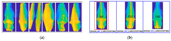 Sometimes, the 3D camera returns distorted images. These bad images are removed using geometric and hole areas. A sample of images discarded due to distortion and touching between cows is shown in Figure 4a. The selected cow images are grouped by ID number. From all of the cow images recorded, filtering ensures that only one good position of cow image for the same ID number on the same day is selected by using the symmetricity parameter, though the camera generally captures three images per day in the milking parlor. Filtering is performed by a comparison of symmetricity. The filtering for cow ID “LA982123529378694” is shown in Figure 4b. This cow has camera capture times (at 04:57 a.m., 13:22 p.m., and 21:21 p.m. on 4th November 2019), and the selected filtered image is shown by a red marker. When the left and right sides of the image are symmetric, the difference between the two areas is nearly zero. The image with the least difference in value is selected as the most symmetric image, filtered from the images collected every day.