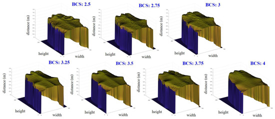 In the 3D image of a cow’s backbone, BCS estimation model 1 was used for ROI 1, which is two-thirds of the whole cow body starting from the tailhead, as seen in Figure 3a. Variations in the amount of fat reserves or in the energy balance are apparent in that region. Moreover, the more that body fat covers the bones, the larger the BCS. Visually, we can clearly differentiate thin cows from fat ones by this coverage by fat. Therefore, roughness parameters are extracted to determine the BCS. Figure 6 shows images composed of cross-sectional slices in ROI 1 for each BCS value between 2.5 and 4 in increments of 0.25. In this proposed region, the following parameters were extracted: