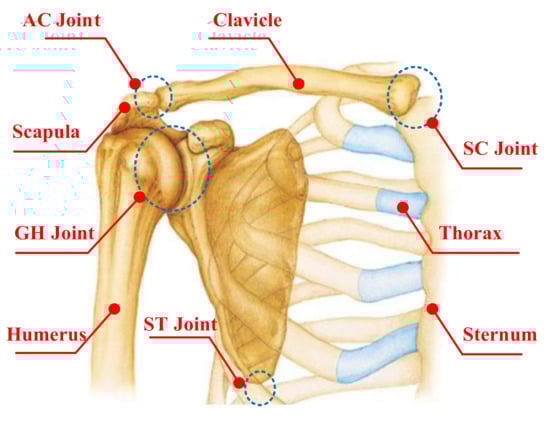 Anthropotomy needs to be understood to model the shoulder’s complex [13,16]. The shoulder complex consists of the shoulder girdle and the humerus, and it includes four bones (the humerus, scapula, sternum, and clavicle) and four joints (the GH, SC, scapulothoracic (ST), and AC joints) [18,26], as shown in Figure 1 [27], which together perform the required functional motions and achieve maximum flexibility in the upper limb movement [28]. In general, the GH joint consists of the humeral head and the glenoid cavity of the scapula, which is usually equivalent to a spherical joint [26,29], and the kinematics of the AC, ST, and SC joints are not clear [30,31,32,33]. Thus, it is difficult to understand the motion characteristics of the shoulder girdle. Theoretically, all the joints and bones of the shoulder complex are particularly complex [25,34]. The mechanistic theory of joint physiology is helpful to understand the shoulder complex kinematics [16].