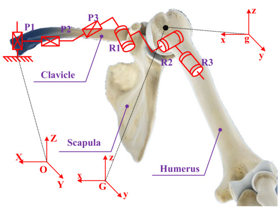 Modeling shoulder motion is fundamental for understanding the dynamic behavior of upper limb, and the compatibility of the upper limb rehabilitation robot with the user is an urgent problem requiring resolution. If the kinematic model of the shoulder complex is not accurate, the designed upper limb rehabilitation robot will be incompatible with the upper limb of the users, and the connective interface of the exoskeleton will generate undesired interactional loads that are exceedingly detrimental to rehabilitation therapy. Therefore, accurate kinematic model of shoulder complex is very important to design the upper limb rehabilitation robot and it has practical significance to ensure the rehabilitation training effect of the affected limbs [1,2,3,4]. Yet, it is difficult to establish a complete kinematic model of the shoulder complex for it is a very complicated and correlative system [5]. In particular, the glenohumeral (GH) joint moves with the functional relevance of the shoulder girdle during humeral elevation [2]. Generally, the GH joint has three revolute degrees of freedom (DOFs) with the axes intersecting perpendicularly in the GH joint center, which is obviously a spherical joint [6]. The model of the shoulder girdle motion is far from simple, and its kinematic characteristics are crucial for remodeling the shoulder complex [5].