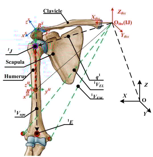 - Yang, J.; Feng, X.; Xiang, Y.; Kim, J.H.; Rajulu, S. Determining the three-dimensional relation between the skeletal elements of the human shoulder complex. J. Biomech. 2009, 42, 1762–1767. [Google Scholar] [CrossRef]
