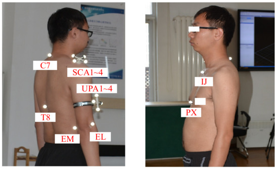 Six skin-mounted markers were attached to the sternum, EL, and EM, as recommended by the ISB [36,37,39,40]. Specifically, four skin-mounted markers (C7, T8, IJ and PX) were used to calculate the thorax coordinate system. The origin of the thorax coordinate system was the IJ. Two skin-mounted markers were located on the EL and EM, which were used to obtain the humeral posture vector. For the humerus, four markers of the block (UPA1-4), which were placed on the right upper arm by pressing the flange, were fixed to the flange. For the scapula, the other four markers of the block (SCA1-4) were placed on the acromion. The movement of the block is equivalent to the movement of the corresponding bone. To simplify the motion analysis, the description of the humerus and scapula do not follow the ISB completely [41,42], as shown in Figure 4.