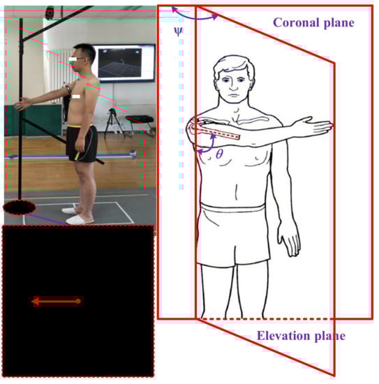 The kinematic measurements of the shoulder complex were recorded with the subjects in the standing position, keeping their arms straight, relaxing the right shoulder hanging naturally, with no elbow flexion. Each subject performed raising, lowering, and RAL of the right arm, using the frame for guidance in the elevation planes, which included sixteen in total (0°, 10°, 20°, 30°, 40°, 45°, 50°, 60°, 70°, 80°, 90°, 100°, 110°, 120°, 130°, and 135°), and the elevation angle in different phases was from 0° to 150° (in order to obtain the elevation angle from 0° to 150°, the range of experimental elevation angle needs to be larger than 0° to 150°). All the subjects performed the motion three times.