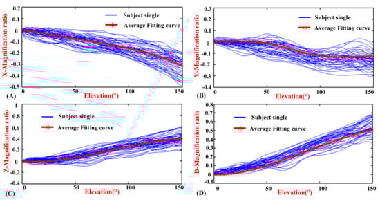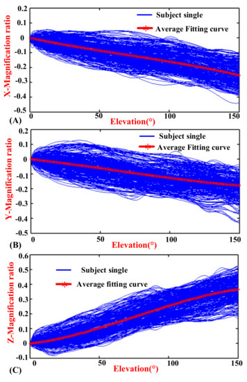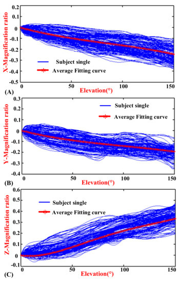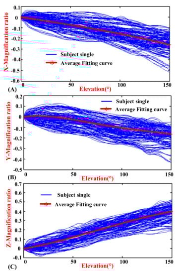 Figure 6, Figure 7 and Figure 8 show the motion curves (blue lines) for the twelve subjects performing humerus raising, lowering, and RAL movements in all sixteen elevation planes, respectively, with elevation angle from 0° to 150°. The movements of GH joint center displacement variable quantity changing in the X, Y, and Z directions during humeral elevation in different phases are observed, which are presented as (A–C) of Figure 6, Figure 7, and Figure 8, respectively. Similar patterns appear in all sixteen elevation planes relative to the humeral elevation. To summarize the motion coupling relationship, the average data points for twelve subjects performing humerus raising, lowering, and RAL movements in all sixteen elevation planes are obtained. According to the above guidelines of curve fitting in “Postprocessing of experimental data”, the polynomials of x, y, and z are acquired in different phases, respectively, which describe the motion coupling relationship between the X, Y, and Z-Magnification ratio of the GH joint center displacement variable quantity relative to the thorax coordinate system and humeral elevation angle.