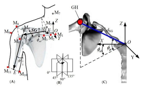 Klopčar used the method of markers (M1–M11) pasted onto the skin of the right shoulder complex, as shown in Figure 9. The angular displacement data corresponding to the joints of the shoulder complex when the upper arm is elevated in the 0°, 45°, 90°, and 135° planes of elevation were obtained. The measurements were combined to cover the entire reachable domains of the humerus in the above-defined planes [7].