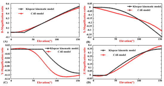 According to (20) and (21), the x(ϕ), y(ϕ), z(ϕ), and d(ϕ) are zero when the elevation angle is zero. For the unity of the results, the constant terms of the dCAK, xCAK, yCAK, and zCAK of the GH joint center displacement variable quantity are ignored, which are shown in (A), (B), (C), and (D) of Figure 11. For further comparison, the displacement variable quantity d(ϕ), x(ϕ), y(ϕ), and z(ϕ) of the Klopčar kinematic model is added.