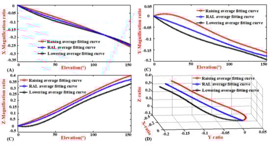 The changes in the Z-direction are shown in Figure 12C. In the raising phase, the magnification ratio and elevation angle are positively correlated during humeral elevation from 0° to 150°, except for a weak correlation in the initial and last stages. In the lowering phase, the magnification ratio is essentially unchanged in the initial stage. The magnification ratio gradually increases in the intermediary stage. The magnification ratio and elevation angle are negatively correlated in the last stage. However, the motion range of the shoulder girdle in the lowering phase is less than that in the raising phase of the humeral elevation, for which the final magnification ratio difference is 0.076. Similarly, the RAL curve is located between the red and black curves.