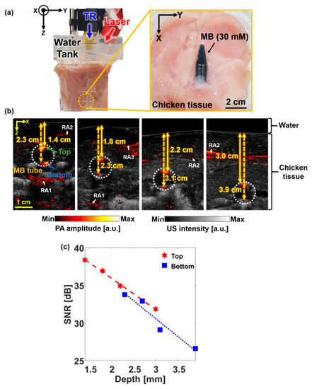 We investigated the deep-tissue imaging capability of SD-PAUSI by imaging MB in the in vitro experiments (Figure 3a). We imaged a transparent plastic tube filled with MB. The concentration of the MB was 30 mM (10 mg/mL), which is typically used in clinic for SLN biopsy [27,39,40]. A beaker was used to stack the chicken tissues. To prevent the laser or acoustic signals from getting reflected from the bottom surface of the beaker, an ~5-cm-thick expanded polystyrene foam was placed on the bottom surface before stacking the chicken. The MB tube was placed between chicken tissues with its long axis aligned perpendicular to the US imaging plane (x-z plane). A water tank with the bottom surface covered by the transparent plastic wrap was positioned over the beaker to couple the chicken tissue pile with the US probe. The laser handpiece was placed diagonally to the US probe using an integrated holder where the angle was adjusted to illuminate the surface of the imaging plane directly. The laser fluence was ~3.8 mJ/cm2 at 650 nm (pulse energy: 24 mJ, beam area: 6.4 cm2), which was well below the American National Standards Institute (ANSI) safety limit (20 mJ/cm2) [41]. To increase the imaging depth, we stacked multiple layers of chicken breast tissue until the PA signal from the target was not distinguishable from the background. All the acquired images were exported offline to calculate the SNR with respect to the imaging depth. To improve the SNRs, we averaged 50 PA image frames at each depth.